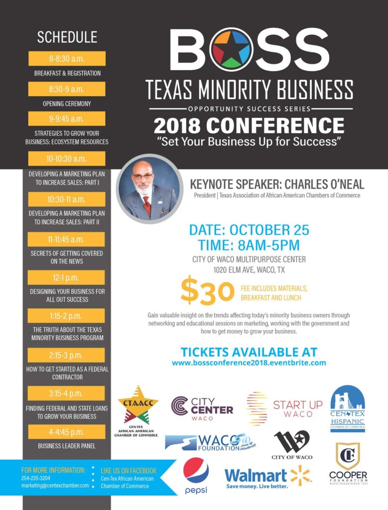 Don’t miss your opportunity to attend the 2018 BOSS Conference! Our keynote speaker will be Charles O’Neal, President of the Texas Association of African American Chambers of Commerce!